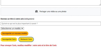 Lorsque vous voulez restaurer un avis ou modèle le bouton envoyer disparait car la zone de texte est considérée comme vide par Amazon tant qu'elle n'est pas modifiée. Il vous suffit d'ajouter un espace ou d'écrire et effacer pour que le bouton envoyer revienne.