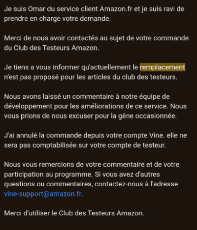 Bien qu’il soit spécifié dans les règles du programme que les retours et le SAV ne sont pas pris en charge pour les produits Vine :