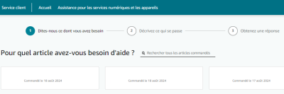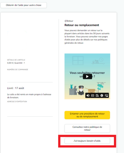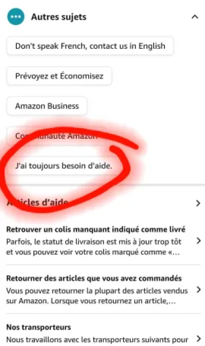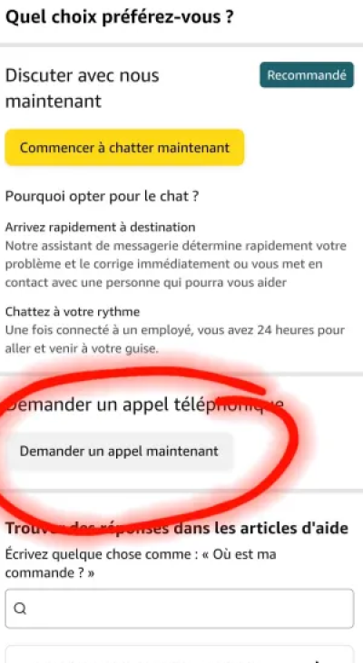 Vous aurez le choix entre cinq catégories, ce qui couvre la plupart des problèmes rencontrés pendant les livraisons. Si vous souhaitez être rappelé il vous suffit de cliquer sur j’ai toujours besoin d’aide et demander un appel téléphonique qui est immédiat. L’appel se passe sur le numéro indiqué dans votre compte Amazon.