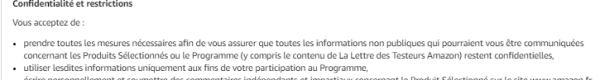 - Vous vous engagez à « restituer à Amazon les Produits Sélectionnées de Tiers et toutes les informations liées à ces produits dans les plus brefs délais sur demande formulée au cours de la période de test de six (6) mois suivant la réception du produit. Si Amazon ne demande pas la restitution du produit au cours de cette période, vous pourrez le conserver. Cette obligation n’est pas d’application sur les Produits Sélectionnés Amazon, »