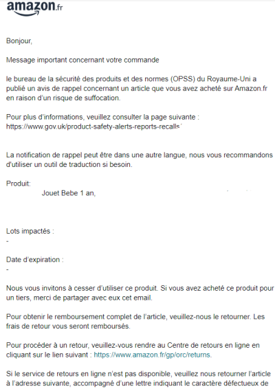 Il n'y a jamais eu de retour via Amazon Vine, mais un produit peut être rappelé en cas de danger sans être obligatoire, lorsqu'il y a un rappel national. Vous recevrez ce genre de mail.