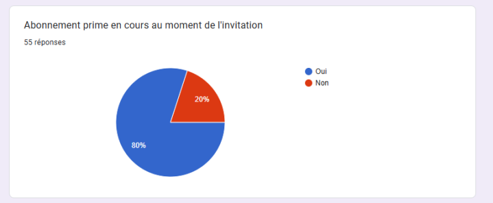 - D’après ces résultats, notre interprétation est que nous ne notons pas d’incidence avec le fait d’être membre Amazon Prime. En effet, 20 % de l'échantillon ne le sont pas et font tout de même partie du programme.